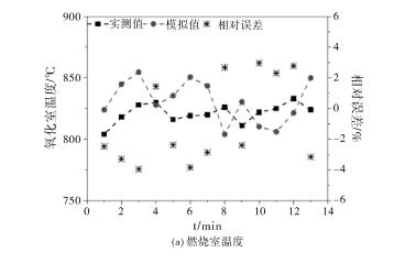 在連續(xù)監(jiān)測穩(wěn)定運行階段多個切換周期后,將燃燒室三個熱電偶及變送器監(jiān)測的爐膛溫度值計算得到平均值,同時將每個蓄熱室中的出口位置熱電偶的溫度值進行記錄,圖2為同一測點的工程實際數(shù)據(jù)與數(shù)值模擬值的對比。通過對比,得到溫度模擬數(shù)據(jù)與實際監(jiān)測值的相對誤差均在4%以內,這也可能是RTO裝置的切換閥因閥板和閥座密封性很難保證、氧化爐爐膛上部的防爆裝置存在泄漏,以及溫度監(jiān)測設備的精確度不夠等問題造成的。因此,燃燒室和蓄熱室溫度測點監(jiān)測值的平均值和模擬值相對誤差滿足數(shù)值模型準確性的要求,所以此數(shù)值模型可以較好的反應RTO裝置在正常運行階段的溫度變化情況。